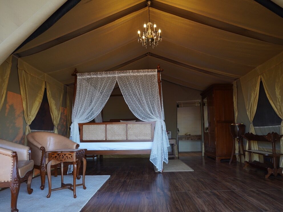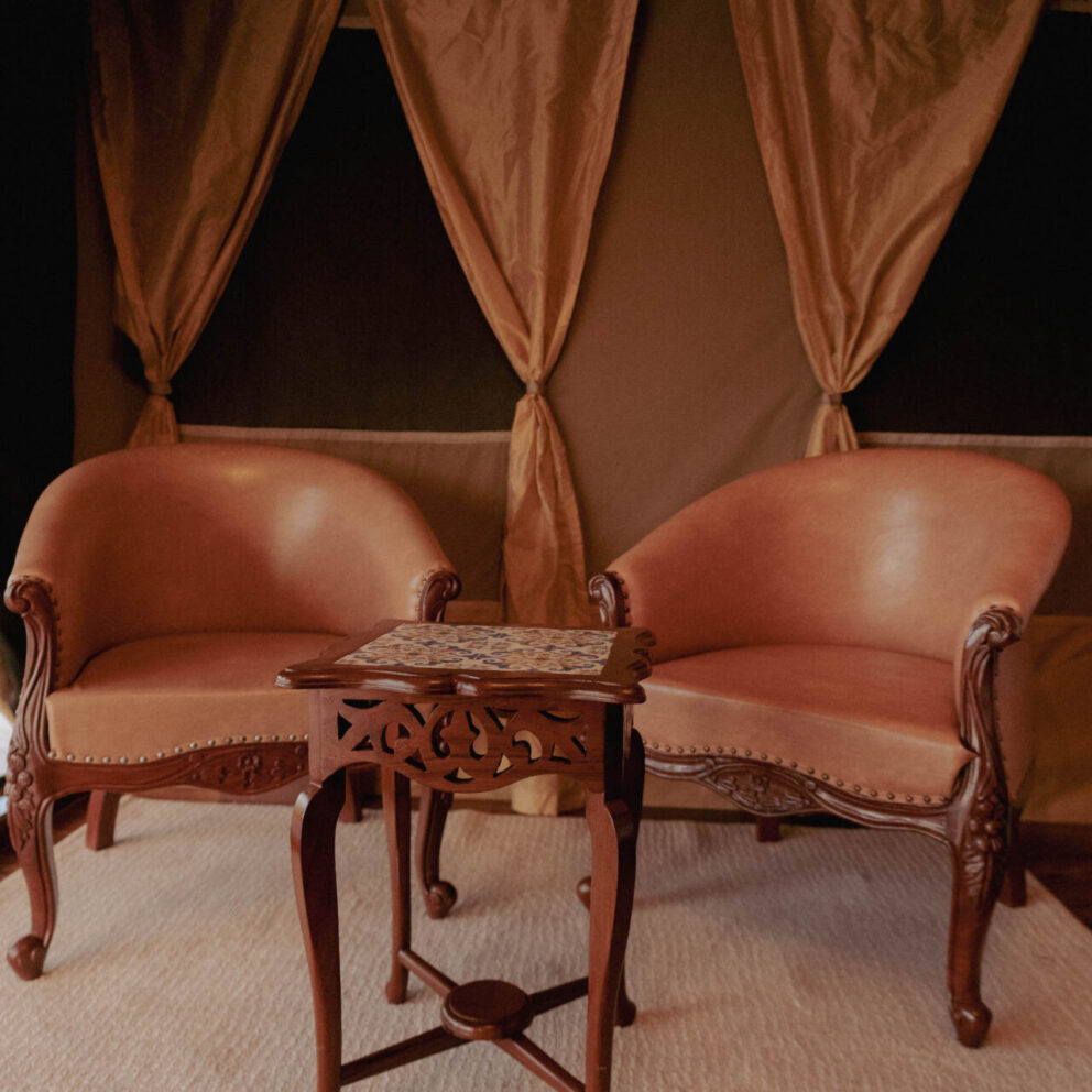 Air conditioned luxury serengeti tent with king size bed and hand crafted vintage furniture.