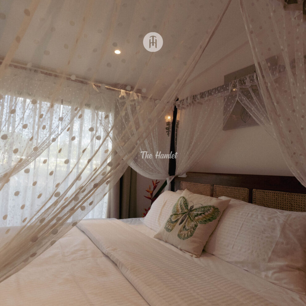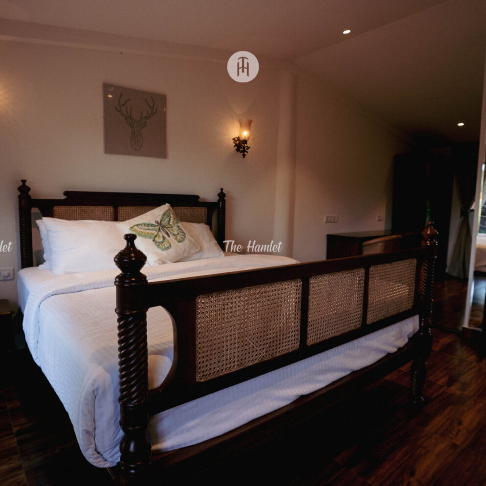 Air conditioned luxury room with king size bed and hand crafted vintage furniture.